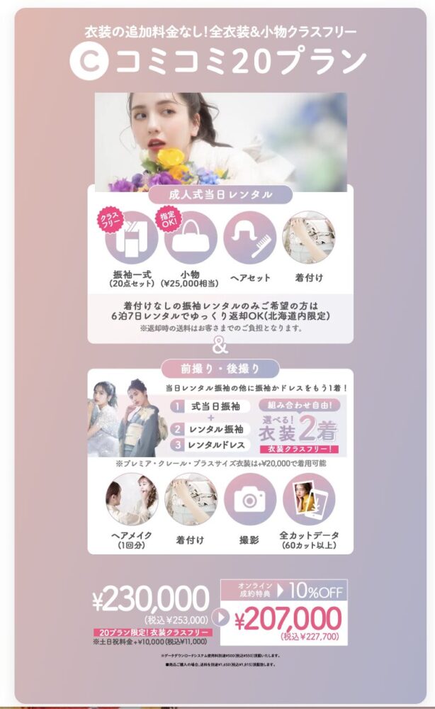 「Cコミコミ20プラン」は、振袖や小物がすべてクラスフリーで選べるプレミアムプラン。追加料金なしで豪華な振袖を選べます。