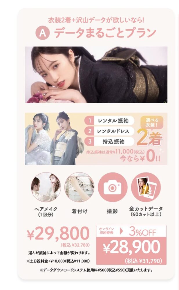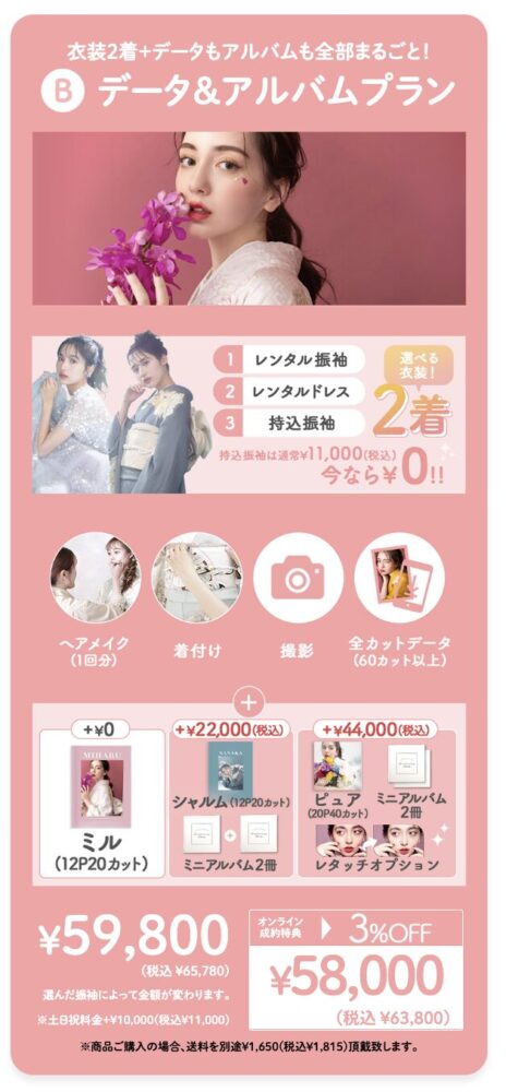 衣装2着と撮影データがたっぷり入ったお得なプラン。