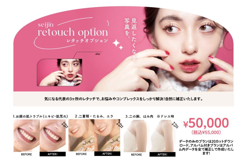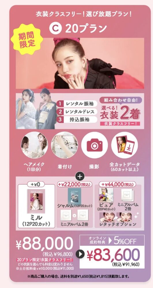 「コミコミ20プラン」を選べば、衣装・撮影・アルバム・レタッチがすべて揃う充実の内容に。安心して成人式準備を進められる大人気プランです。