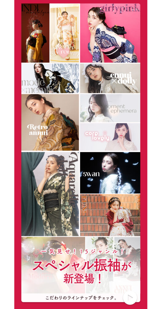 ぱれっとでは、個性に合わせて選べる15ジャンルのスペシャル振袖もラインナップ。