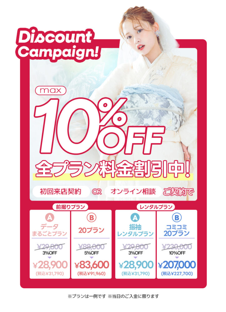 今回のキャンペーンでは、初回ご来店契約またはオンライン相談でのご成約をいただいた方に、全プランが最大10%OFFになる割引をご用意。