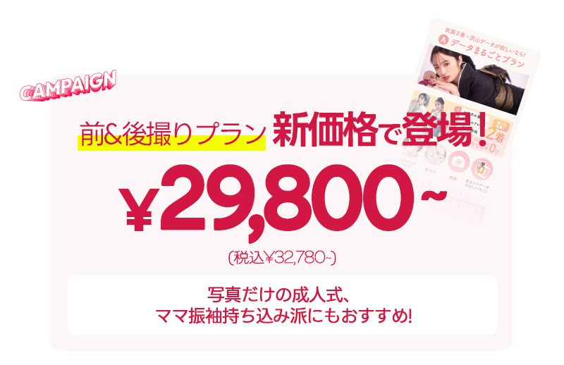 「成人式は写真だけで残したい」「ママ振袖を活用してコストを抑えたい」という方におすすめなのが、前撮り&後撮りプラン。