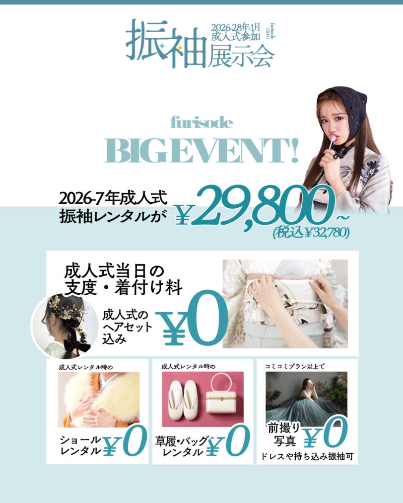 振袖レンタル29,800円(税込32,780円)〜のBIG EVENTプラン