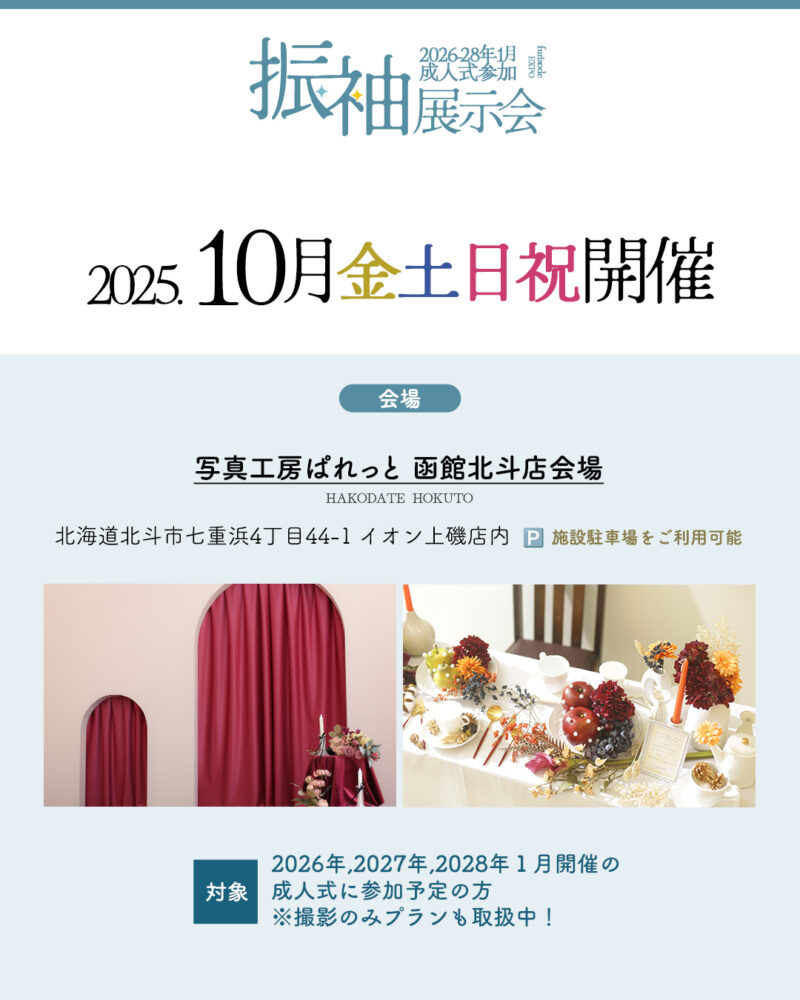 2025/10/03【2025年10月開催】新作衣装試着会!函館振袖レンタル展示会|写真工房ぱれっと函館北斗店