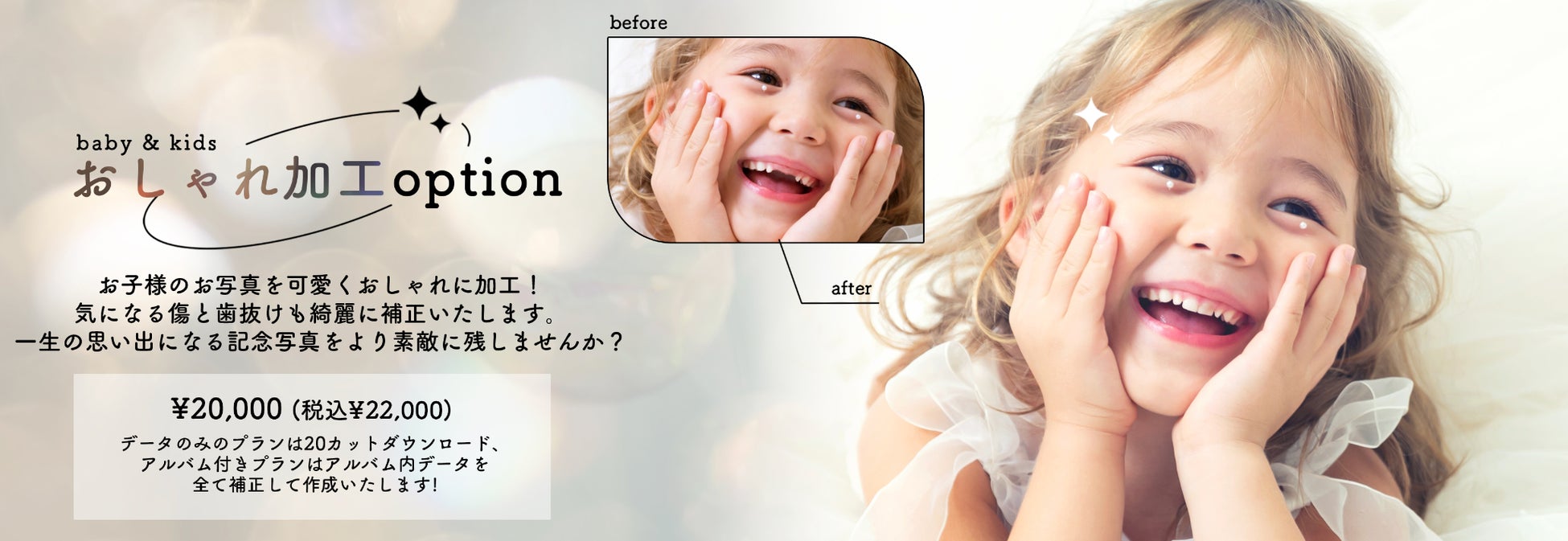 お子様の記念写真を撮るタイミングで顔に傷ができてしまったり、歯が抜け替わってしまったり。そんなアクシデントに対応できる「おしゃれ加工オプション」を全店でスタートしてます! プロのデザイナーが、お子様の大切なお写真を自然に、美しく整えさせて頂きます。