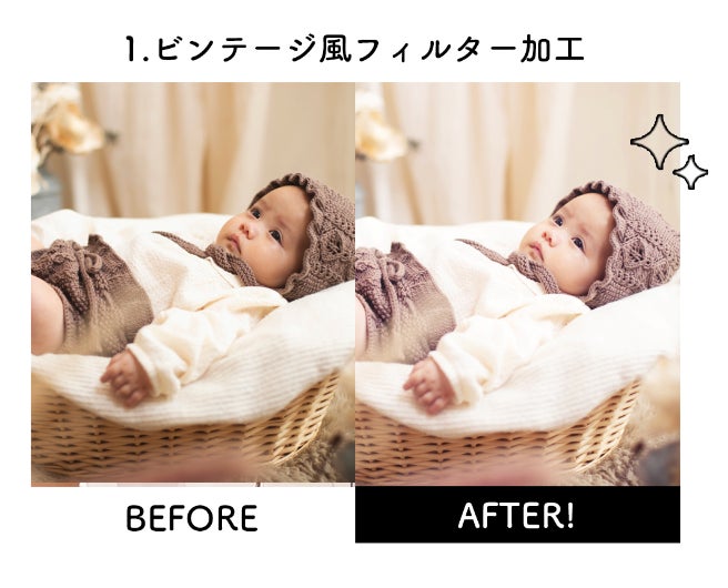 デザイナーがお写真の雰囲気にあわせて、フィルター加工を施します。オシャレ度UPのアルバムに仕上がります。