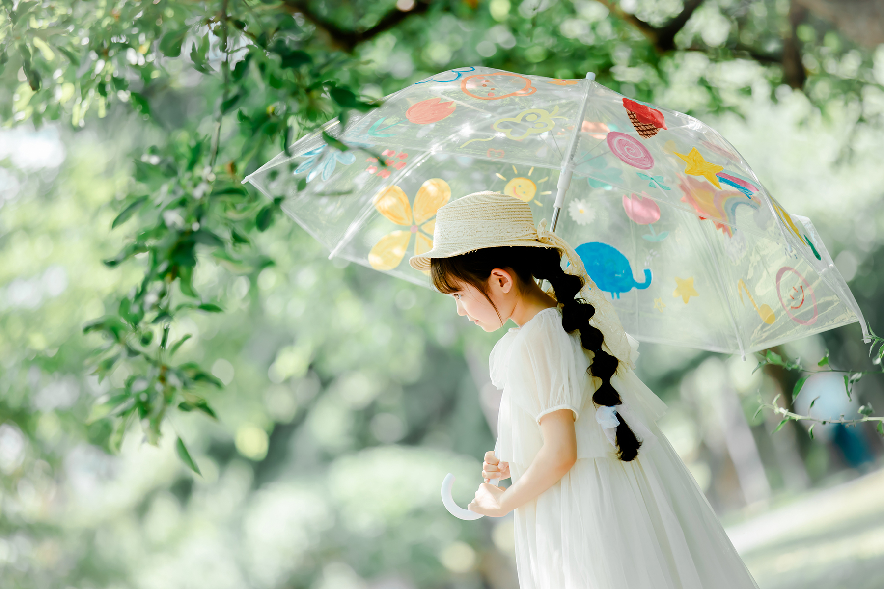 手描きのイラストが描かれた透明な傘をさして、物語の世界に浸るお子様の横顔。