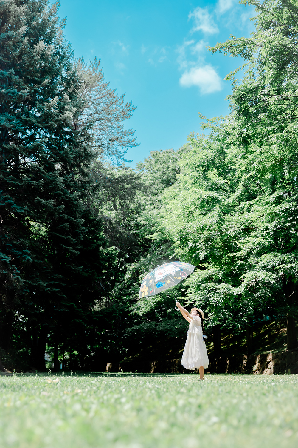 西野緑道を彩る豊かな樹木と柔らかな光は、ドレスの繊細なフリルや、風になびく髪の質感までも鮮やかに描き出します!