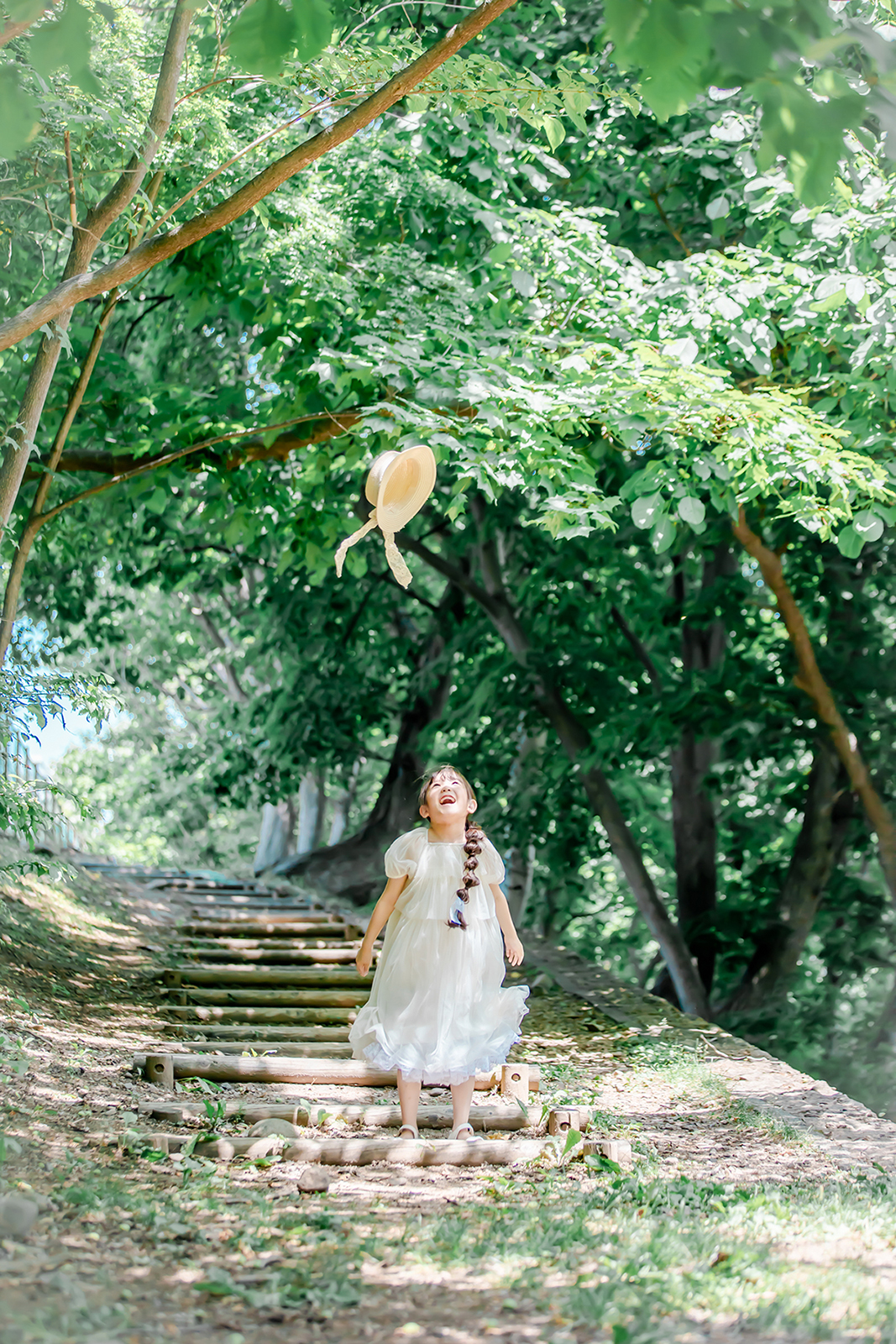 キラキラと輝く木漏れ日が降り注ぐ西野緑道の木製階段で、麦わら帽子を高く投げて無邪気に笑うお子様の躍動感があふれる瞬間!