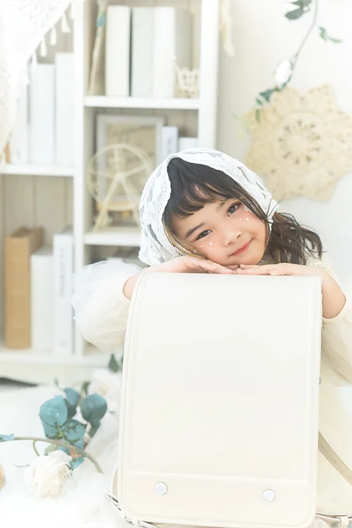 ランドセル:入学撮影の主役です。カバーなどは外しておくと、ピカピカの質感が綺麗に残せます。
