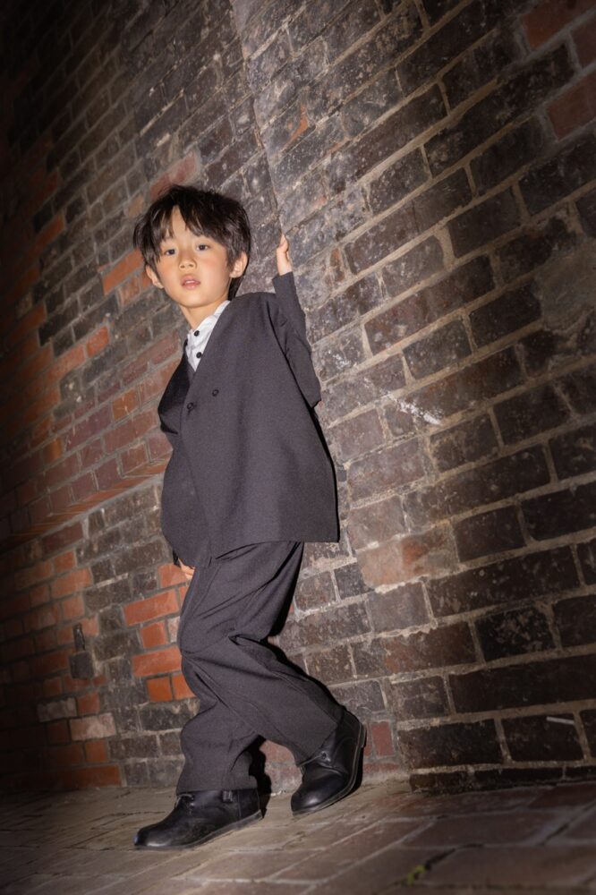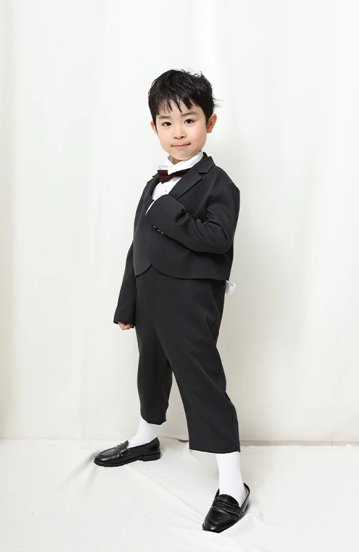 短めのジャケット丈が、お子さまの軽やかな動きを邪魔せず、それでいて背筋が伸びるような気品を感じさせてくれます!
