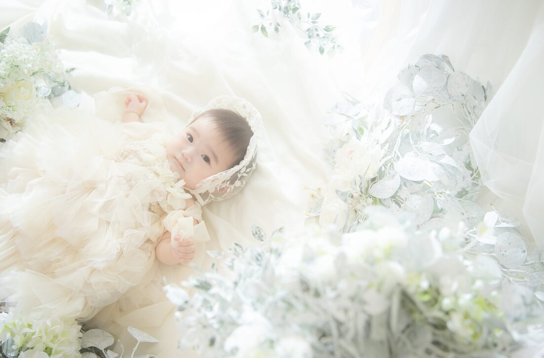 【ベビーモデル撮影】ふんわりドレスとお花に包まれて|写真工房ぱれっと函館北斗店