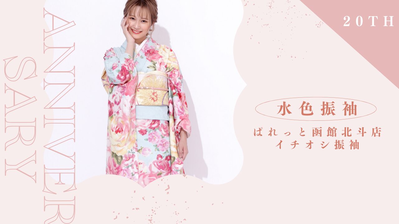 【イチオシ振袖紹介】水彩画タッチの薔薇がロマンティック!ぱれっと函館北斗店で叶える水色振袖コーディネート