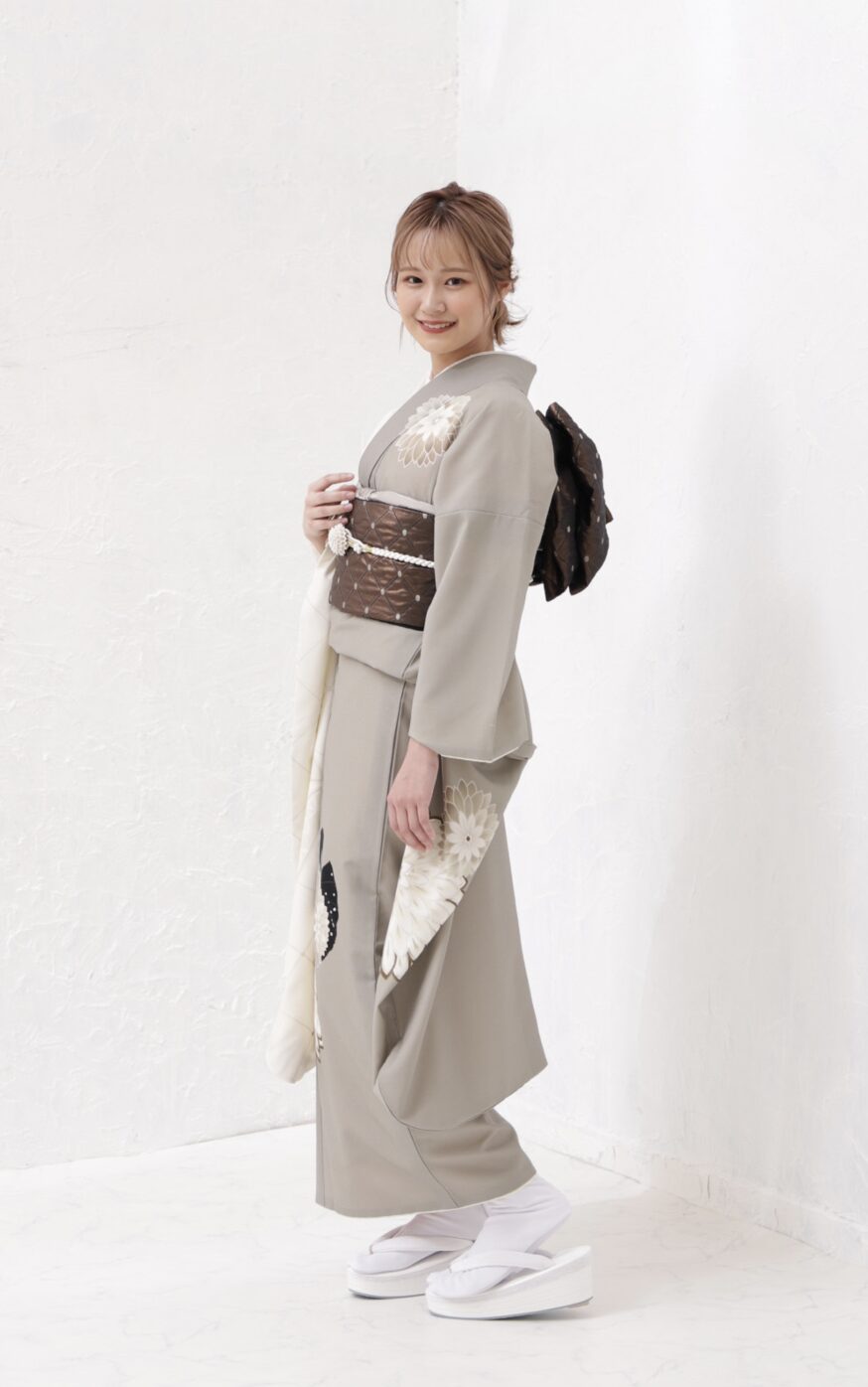 白とグレージュのアシンメトリーがおしゃれな振袖