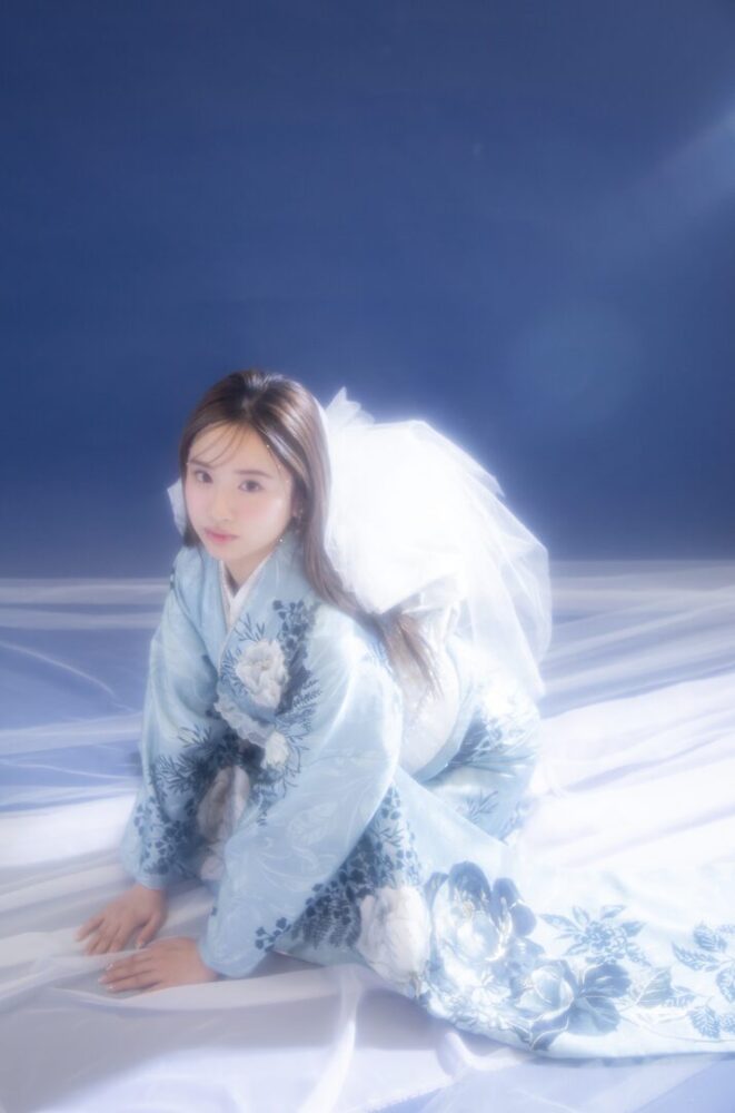 淡い水色に大花柄をあしらい、清楚で爽やかな印象。前撮りスタジオでの撮影にも映える人気カラーです。