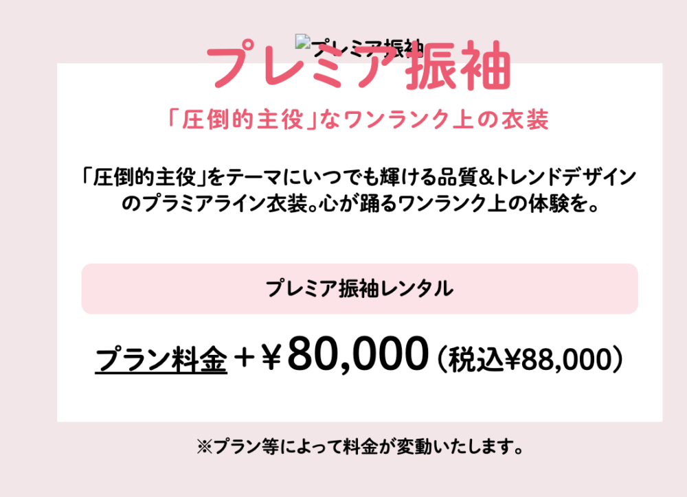 プレミア振袖は、通常の振袖レンタルプランに +80,000円(税込88,000円) でご利用いただけます。