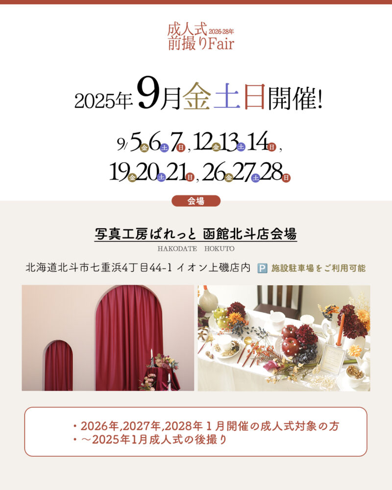 写真工房ぱれっと函館北斗店では2026・2028年成人式を対象にした「成人式前撮り相談会」を 9月の金、土、日に開催いたします。 今月の開催も残り3日!ぜひお見逃しなく!