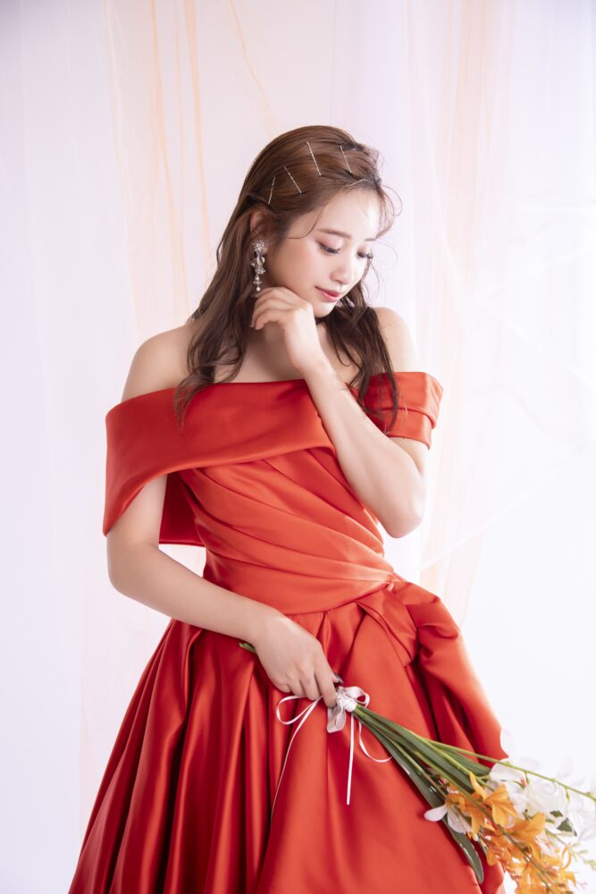 サテンオレンジのドレスは肌色を明るく見せてくれてヘルシーかつ元気な雰囲気に!