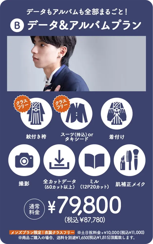 内容:紋付き袴、スーツ(持込またはタキシード)、着付け、撮影、全カットデータ(60カット以上)、肌補正メイク