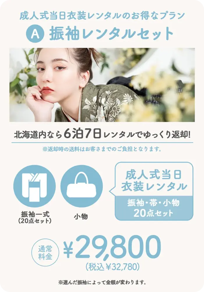 内容:振袖一式(20点セット)、小物、6泊7日レンタル