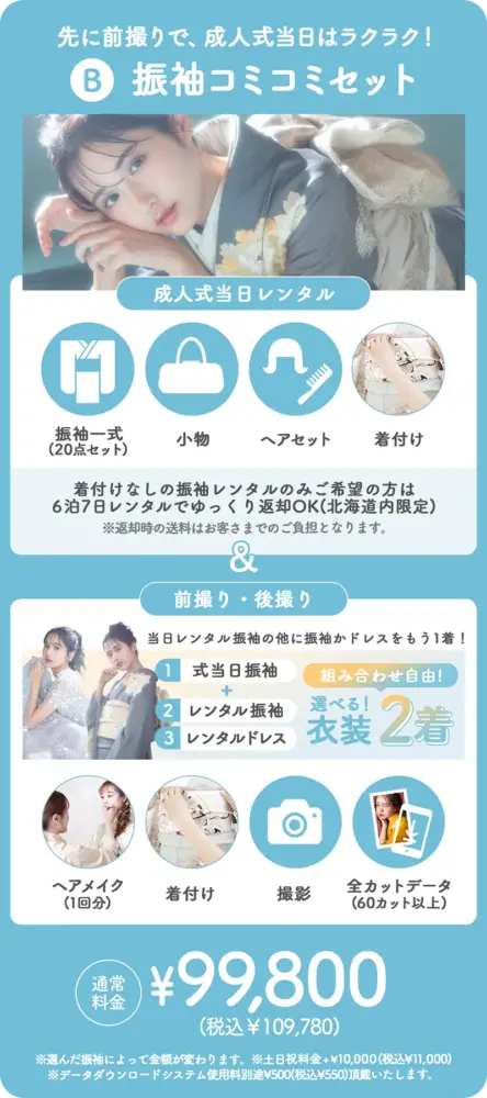 内容:振袖20点セット+小物、式当日レンタル+前撮りまたは後撮り、衣装2着、全カットデータ
