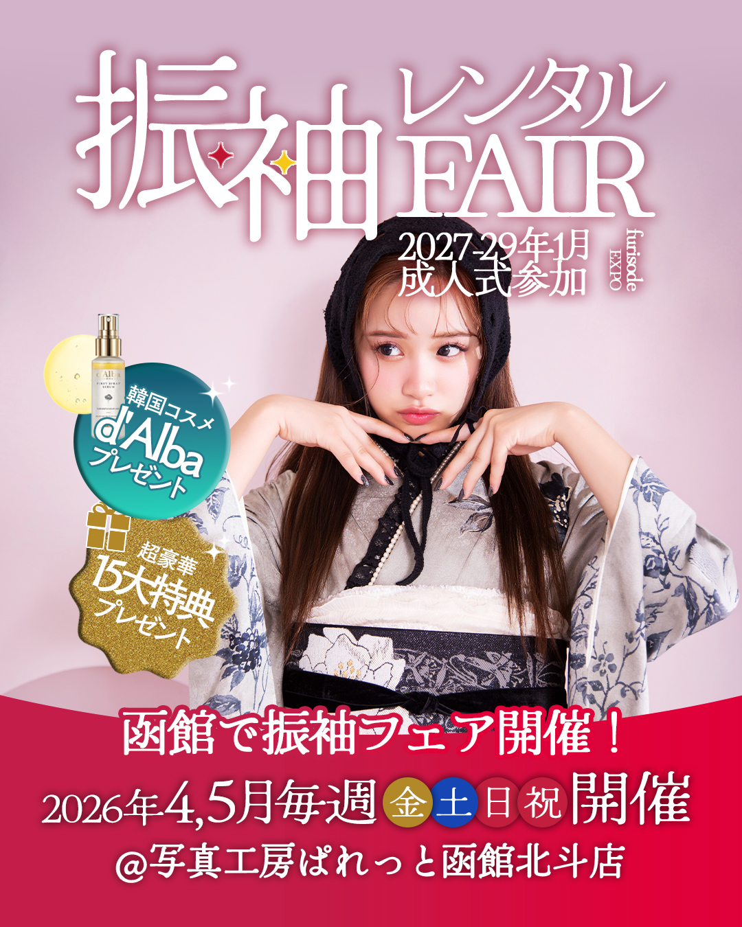 2026/04/04▼函館振袖レンタル展示会開催▼ 豪華特典盛りだくさんの《SPECIAL振袖展示会》 【日時】4月5月毎週金土日祝日で イオン上磯店 写真工房ぱれっと函館北斗店にて。 今年度入荷予定の新作衣装もご試着可能となっております! 展示会シーズンのみのご試着を予定しておりますのでぜひお越しください! ご予約受付中!