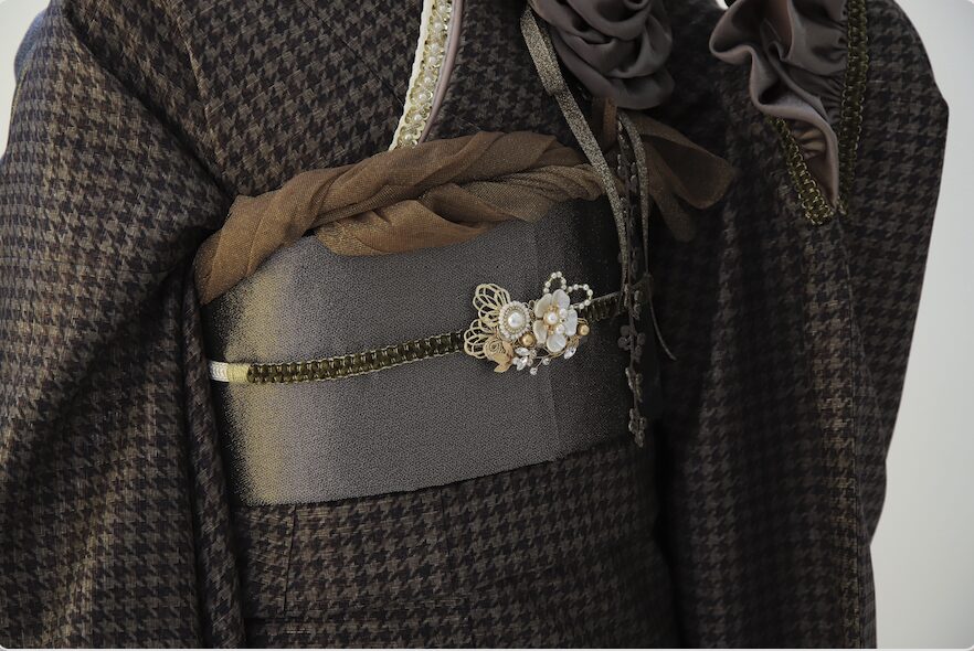 ゴールド&パールの小物使い 帯締めにはパールやラインストーンをあしらったデコラティブなものをチョイス。カーキの落ち着いた色味に、上品な輝きを添えるのがポイントです。