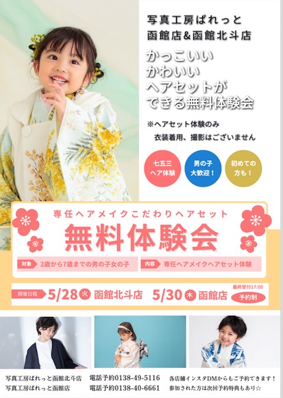 皆様こんにちは! 写真工房ぱれっと函館北斗店です!! 七五三無料体験会実施します!! ぜひ、最後までぜひご覧ください!!!