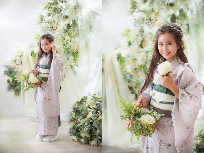 背景とマッチした淡くやわらかなお着物が可愛らしさをより一層引き立てます。