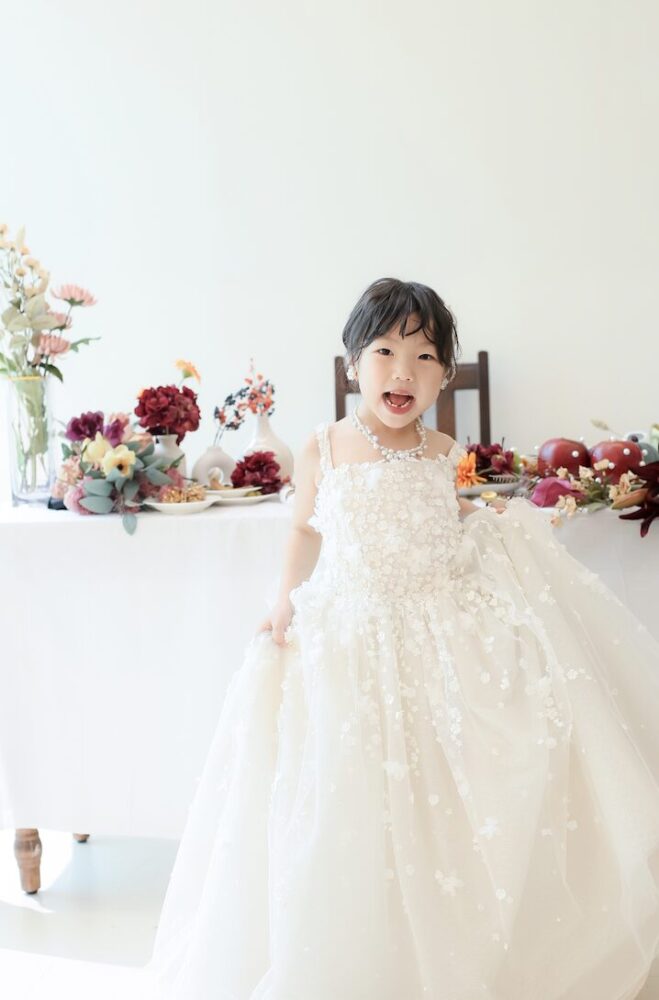 細やかなビーズがきらきら輝く、純白の七五三ドレス。