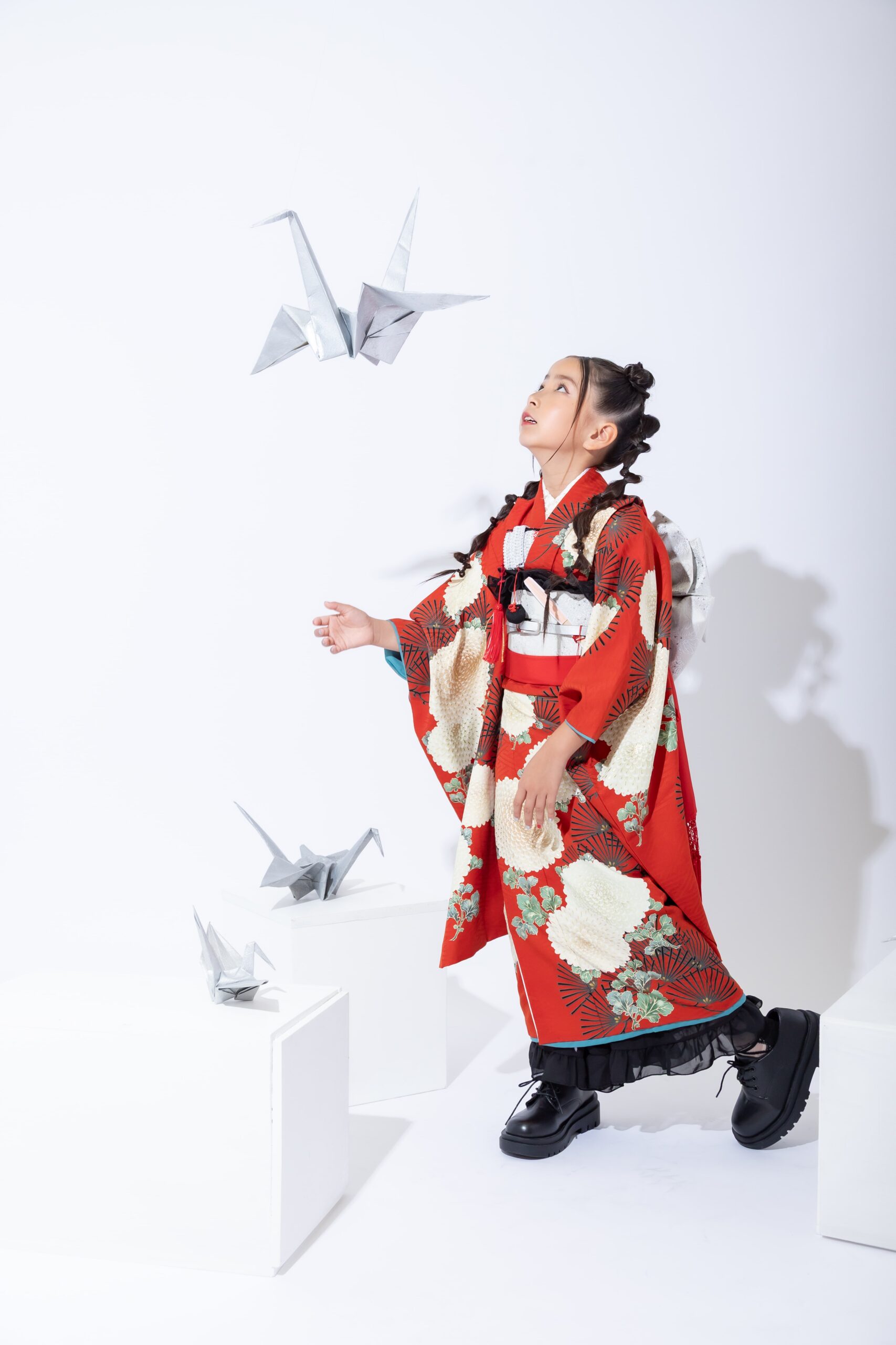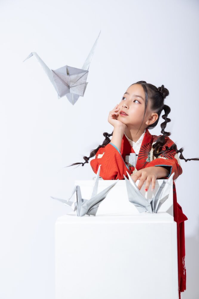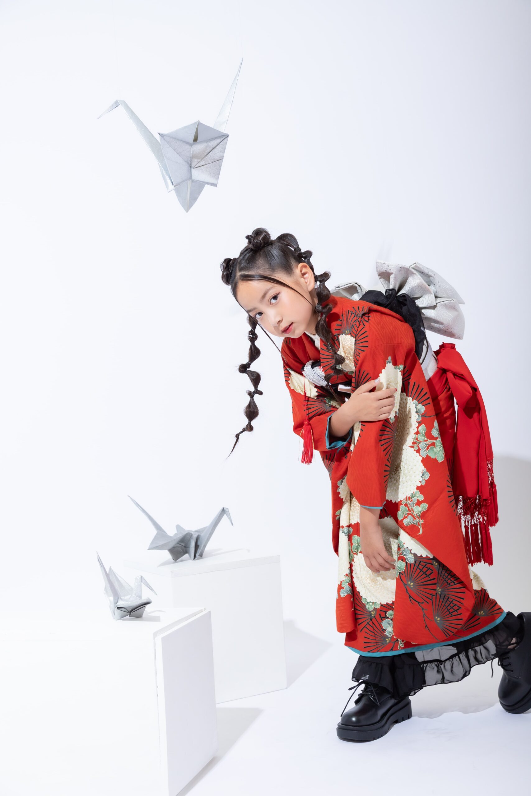 和紙の折り鶴や赤い着物が伝統的な七五三スタイル!