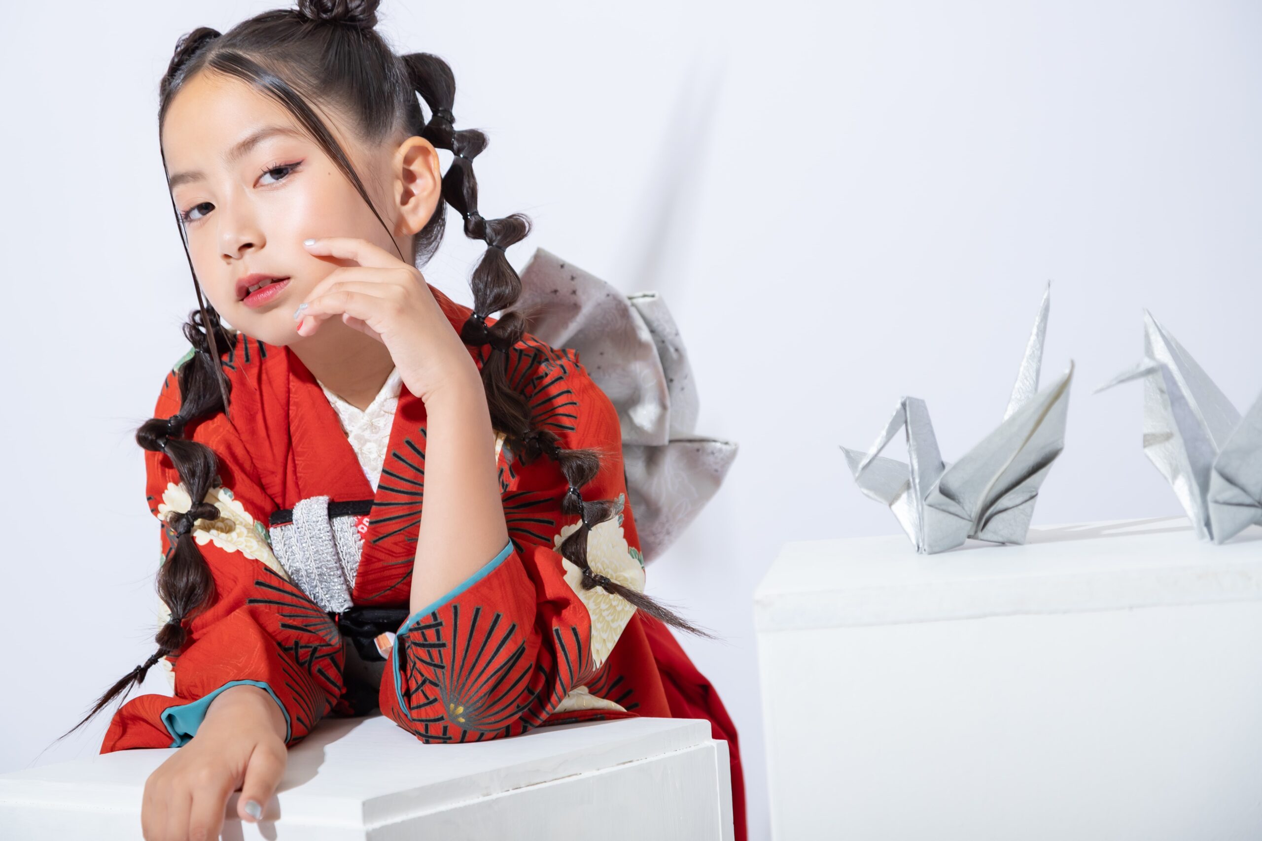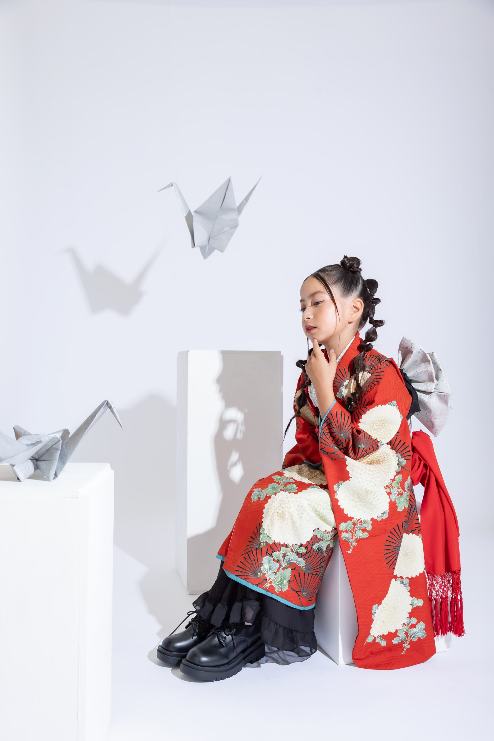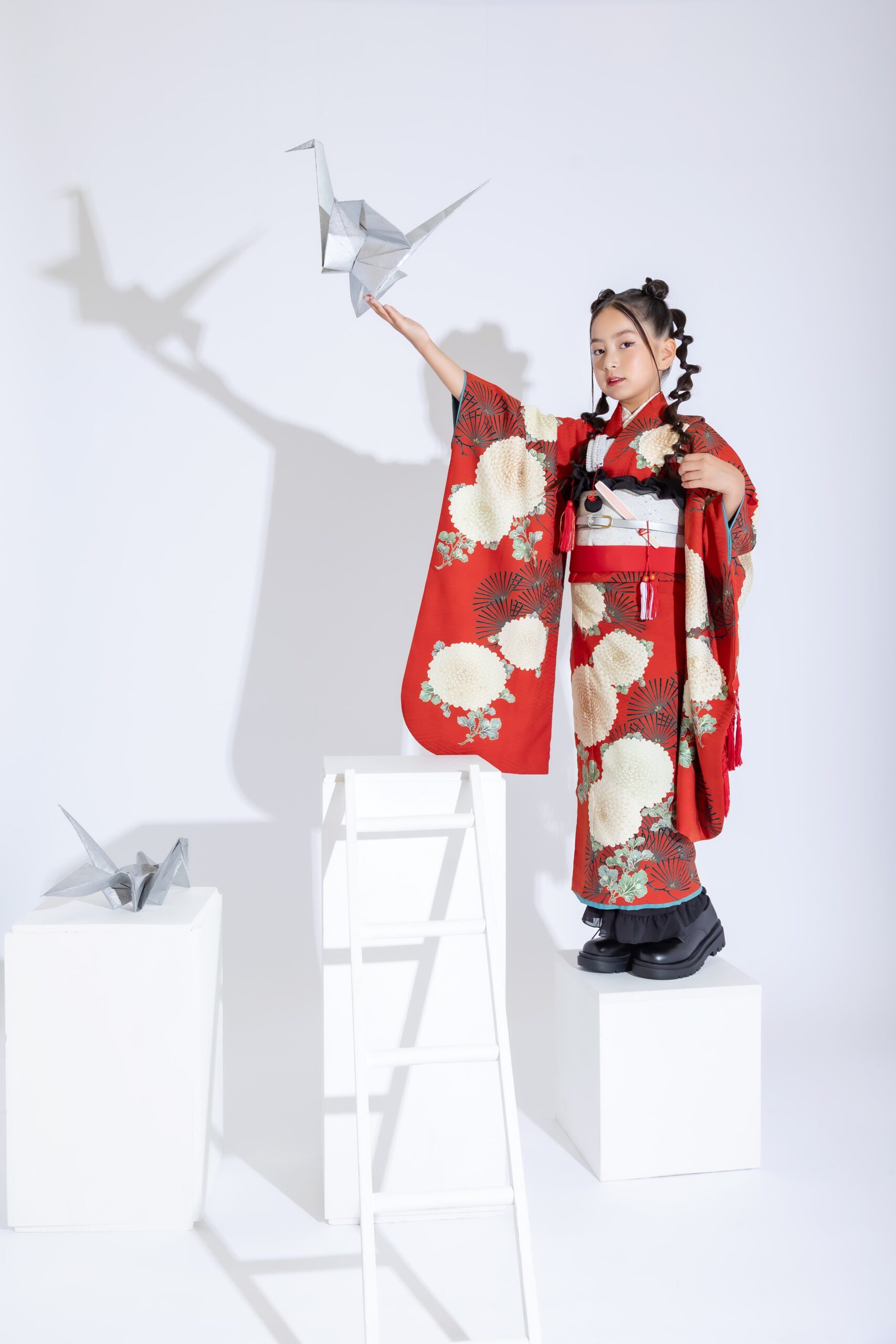 和紙の折り鶴や赤い着物が伝統的な七五三スタイル!