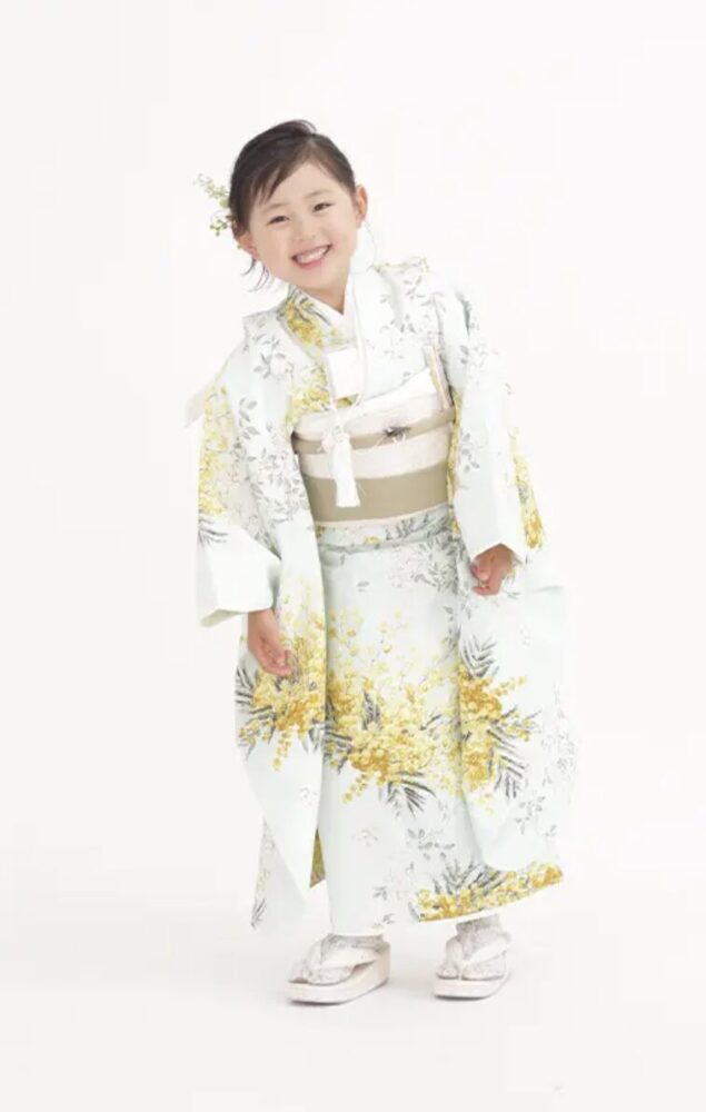 2025年のトレンドカラー・ホワイトベースに、鮮やかな黄色のミモザ柄が入った大人気コーデ。SNSでも注目されており、「おしゃれ七五三」として大好評。