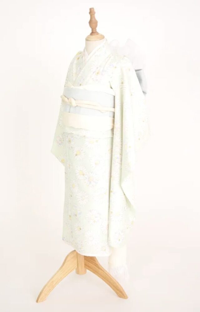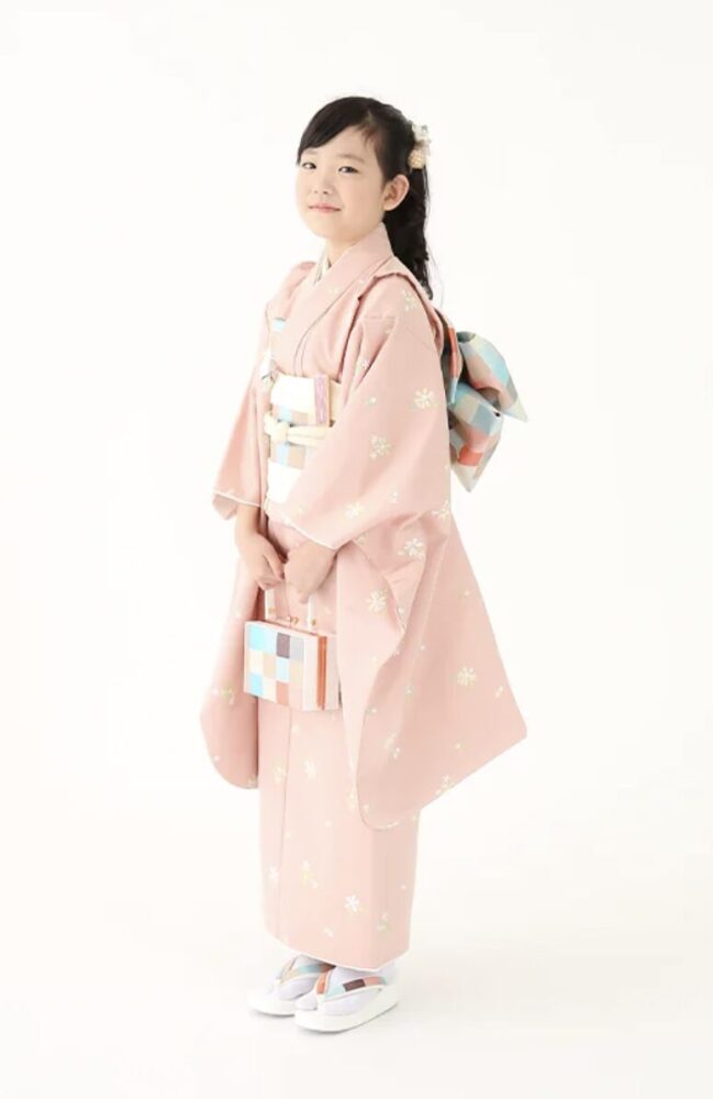 落ち着いたくすみピンクに、淡い市松模様の帯がポイント。大人っぽさと可愛らしさの絶妙なバランスで、近年人気急上昇中。