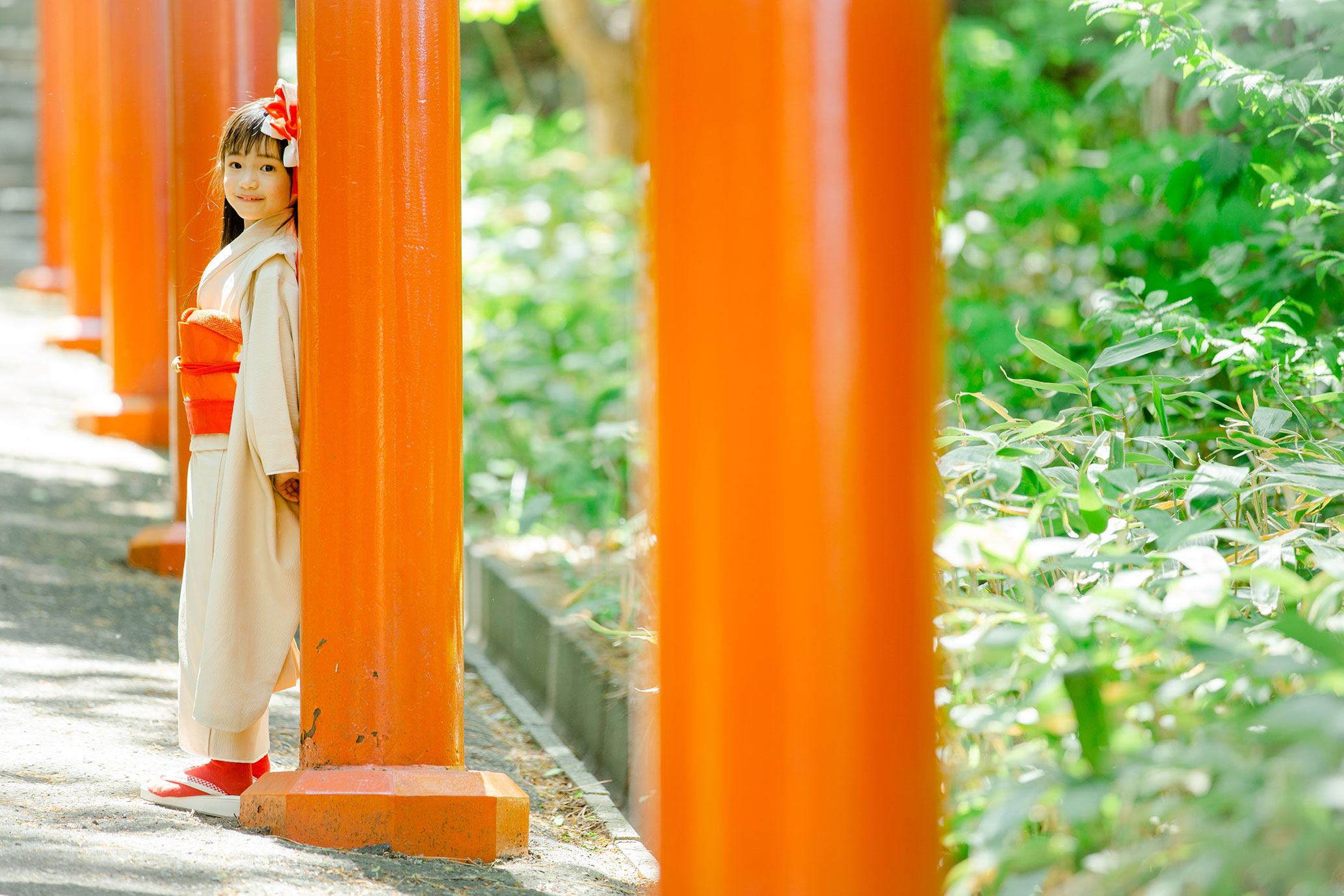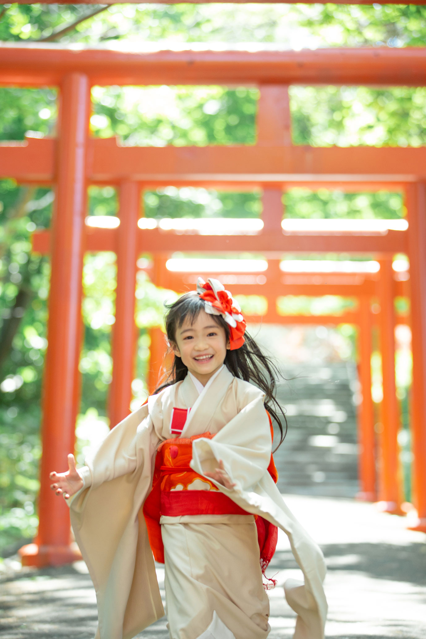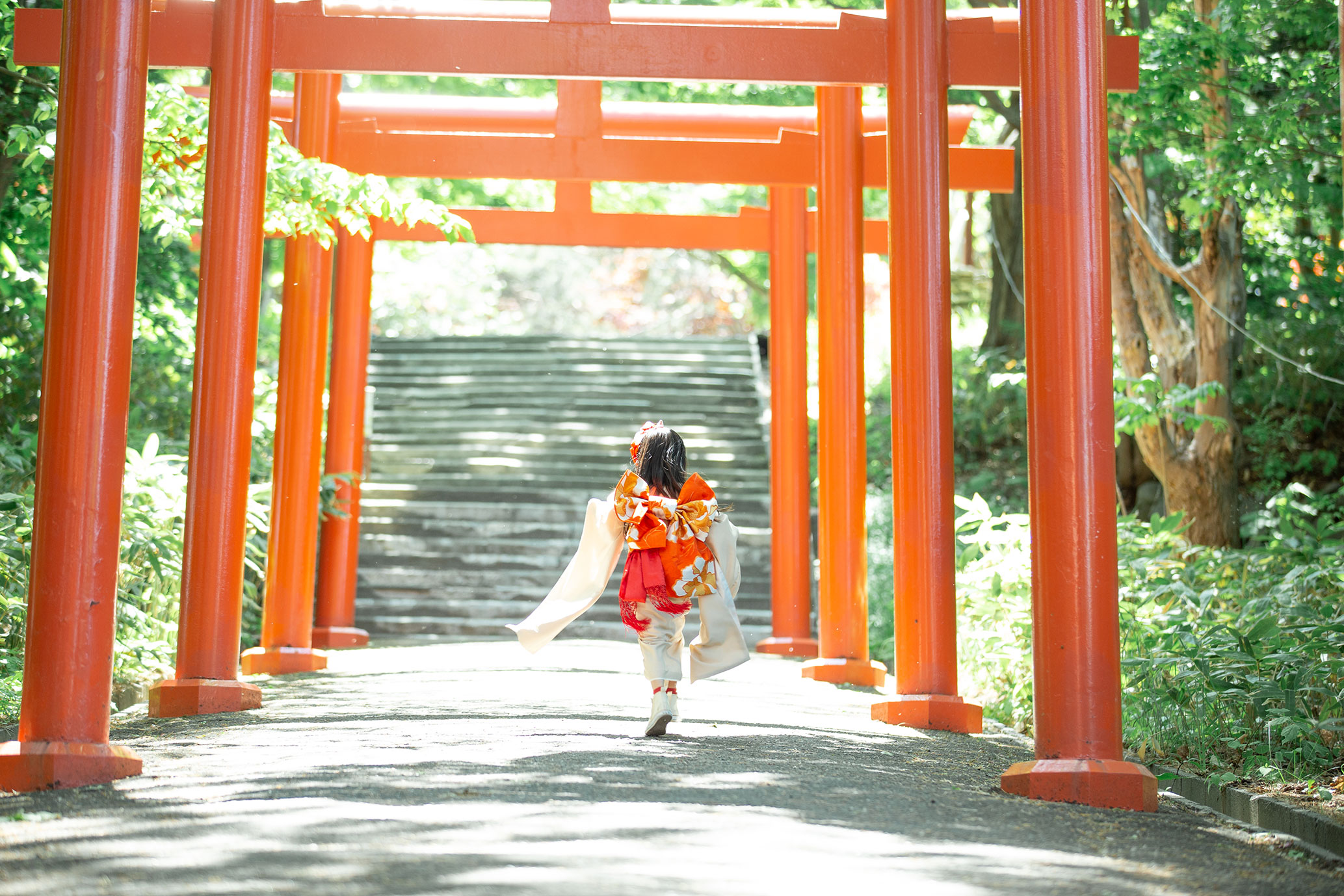 ずらりと並ぶ朱色の鳥居が、七五三やお正月のお着物姿を最高にドラマチックに、そして色鮮やかに引き立ててくれます。
