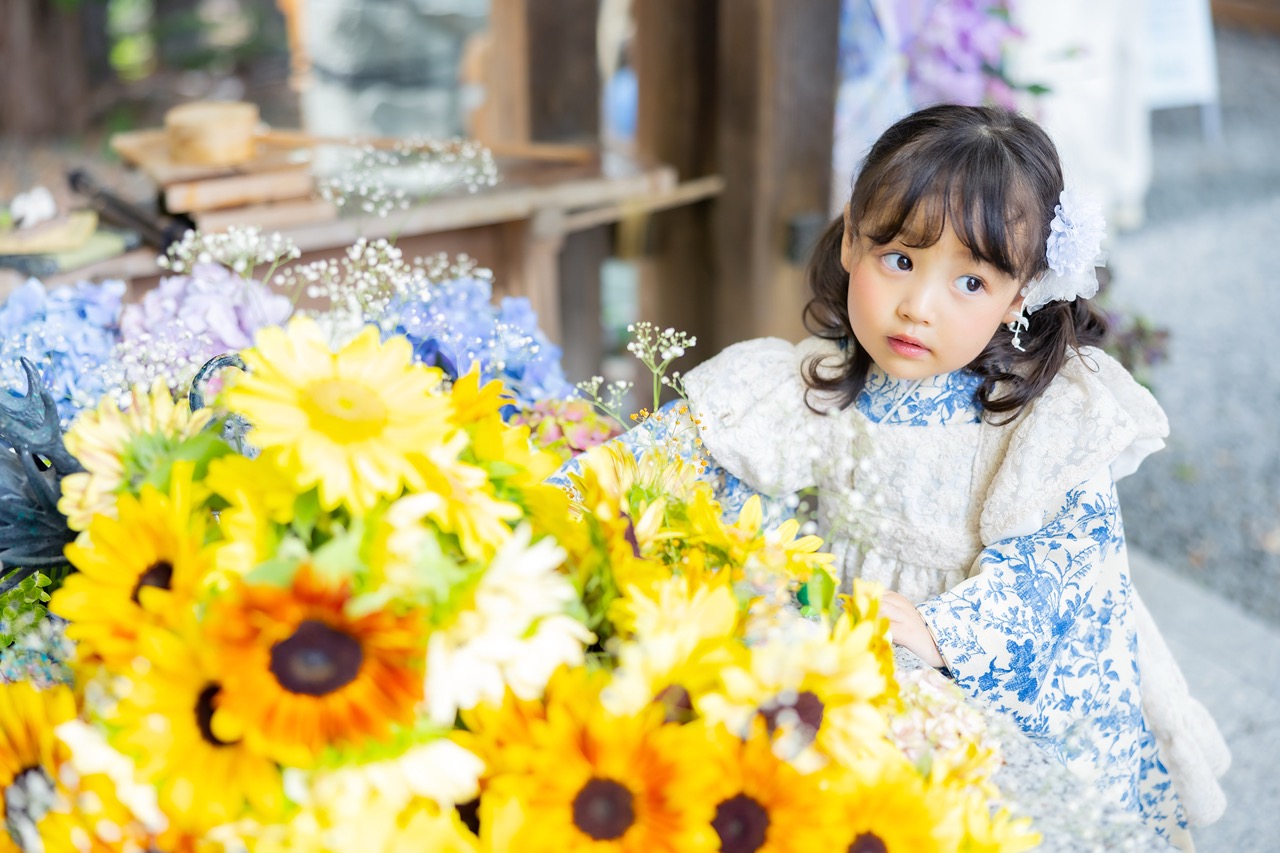 色とりどりの季節のお花とお子様の艶やかな和装が重なると、まるでお人形さんのような愛くるしい写真が撮れるんですよ。