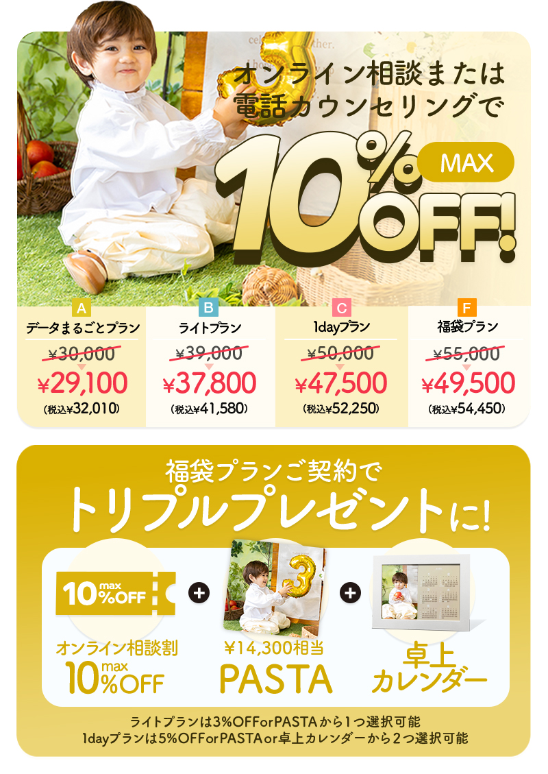 写真工房ぱれっと、Palette+plus全店舗で、家族みんなでW記念を一緒にお祝い。W記念のお写真を楽しみませんか?お誕生日の前後3週間以内での撮影で通常プランに特別な特典をプレゼント☆