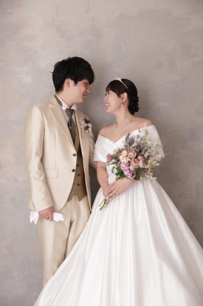 真っ白なオフショルウェディングドレスとシャンパンゴールドのタキシードを合わせて