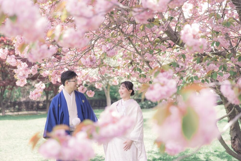 歴史的な建物である豊平館と桜のコントラストは、和装にもドレスにも美しく映えます。