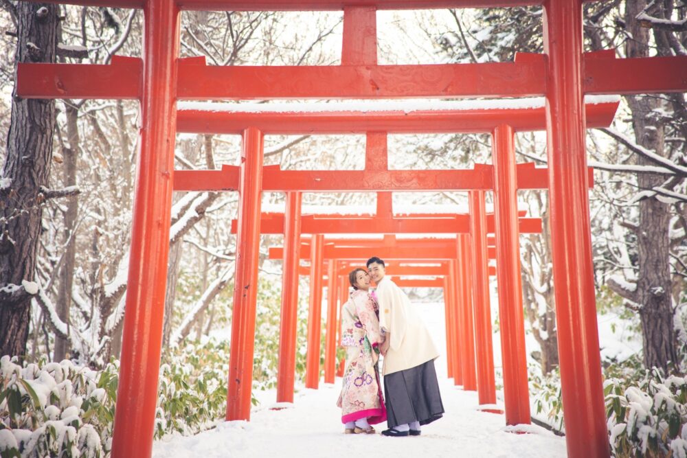 札幌で結婚が決まったお二人へ。和装での前撮りを考えているなら、3月の「札幌 伏見稲荷神社」でのロケーション撮影が、一年の中でも特におすすめのタイミングです。 春を待ちわびるこの季節、神社に並ぶ鮮やかな朱色の鳥居と、まだ残る白い雪のコントラストは、息をのむほど美しく、お二人の門出を華やかに彩ります。