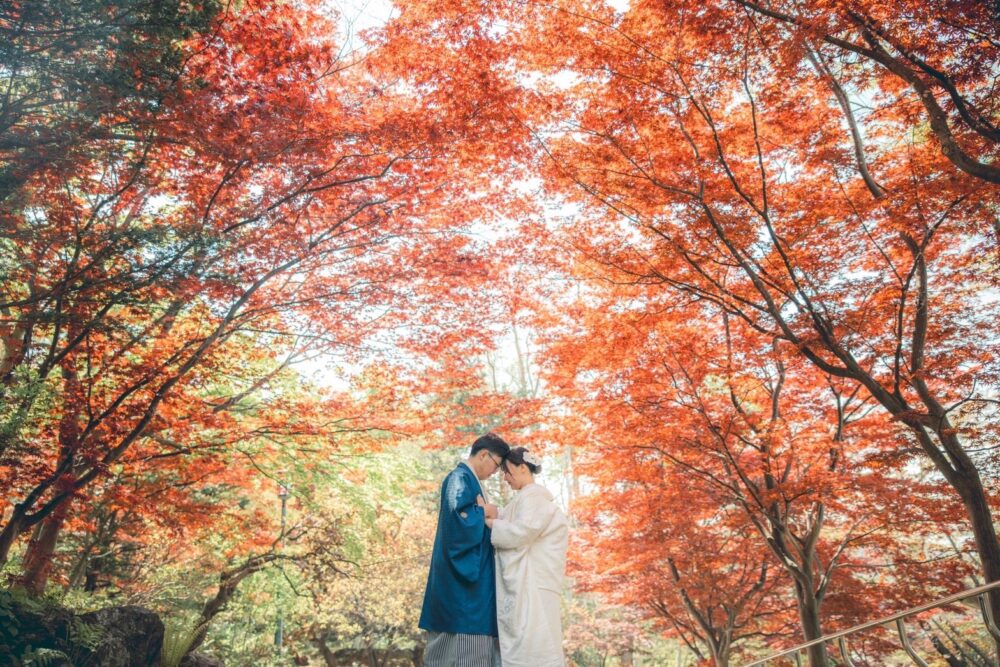 札幌市内の公園が鮮やかな赤や黄色に染まるこの時期は、挙式を控えたお二人の「前撮り」需要もピークに。