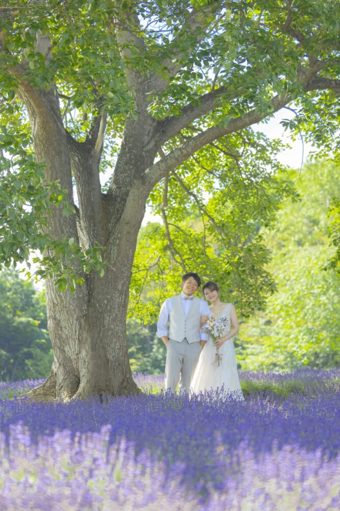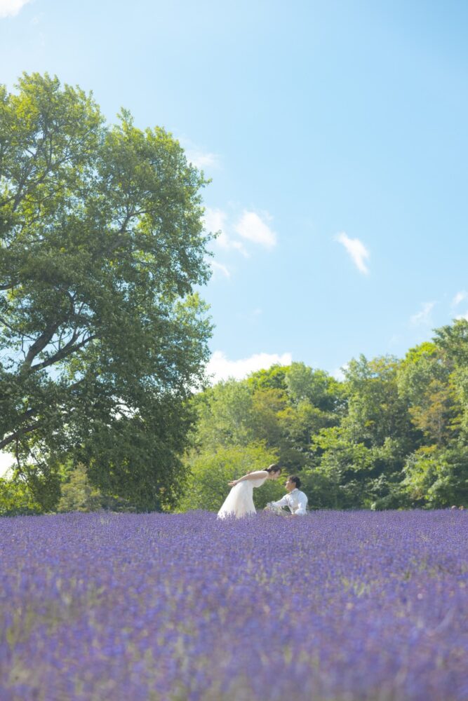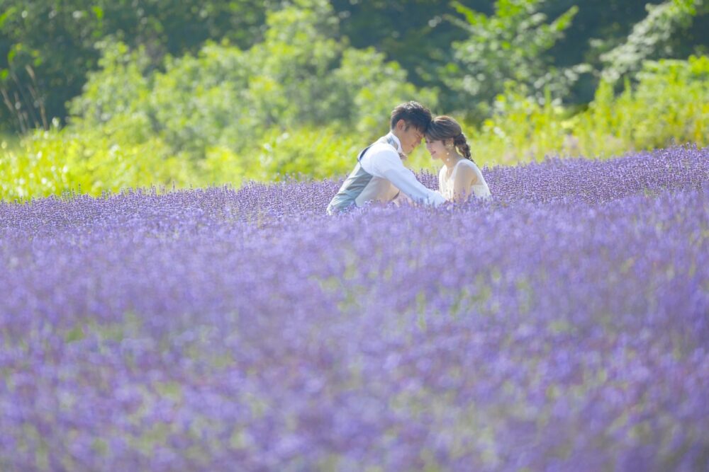 風に乗って漂うラベンダーの優しい香りに包まれながらの撮影は、緊張しがちなお二人の心を自然と解きほぐし、