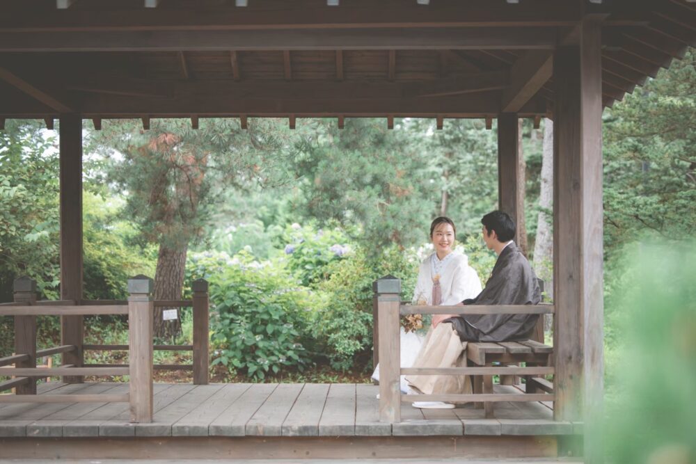 手入れの行き届いた松や趣のある池、そして季節の移ろいを感じさせる木々は、白無垢や色打掛の美しさを最大限に引き立ててくれます。