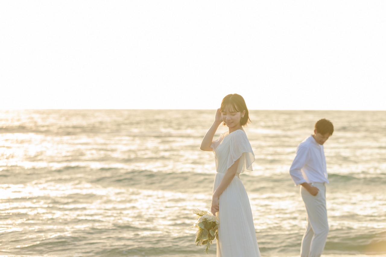 広々としたビーチだからこそ、ドレスの裾を軽やかに持ち上げて、リラックスした表情をたっぷり残せます。