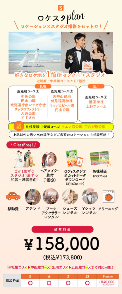 ・ロケーション衣装1着ずつ & スタジオ衣装1着ずつ (和洋装自由・どちらもSSまでクラスフリー!Premier lineのみ別料金)