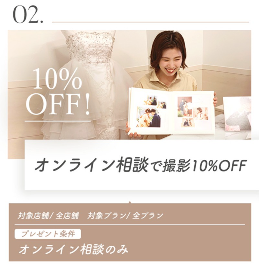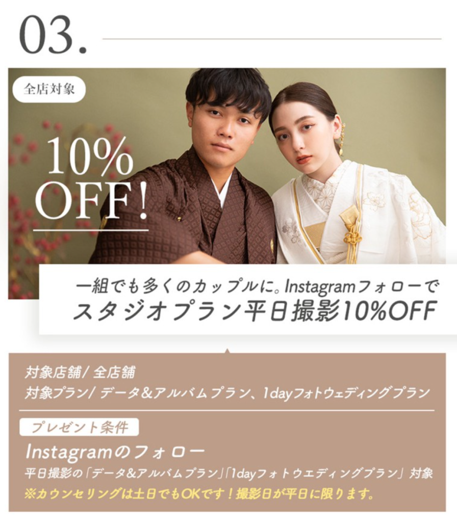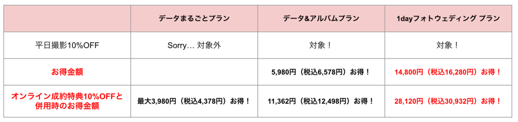 撮影日を平日に設定していただくと平日撮影10%OFFの特典がご利用いただけます♩