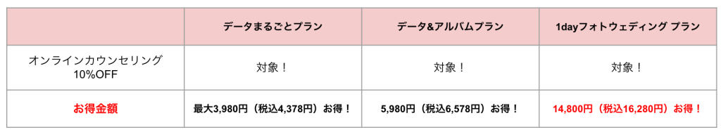 いずれも【花嫁様衣装2着保証】【花嫁様のヘアメイク無料】【全カットデータプレゼント】など