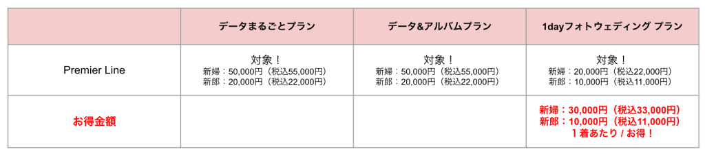 Premier Line のお衣装は、通常、新婦55,000円、新郎22,000円です。