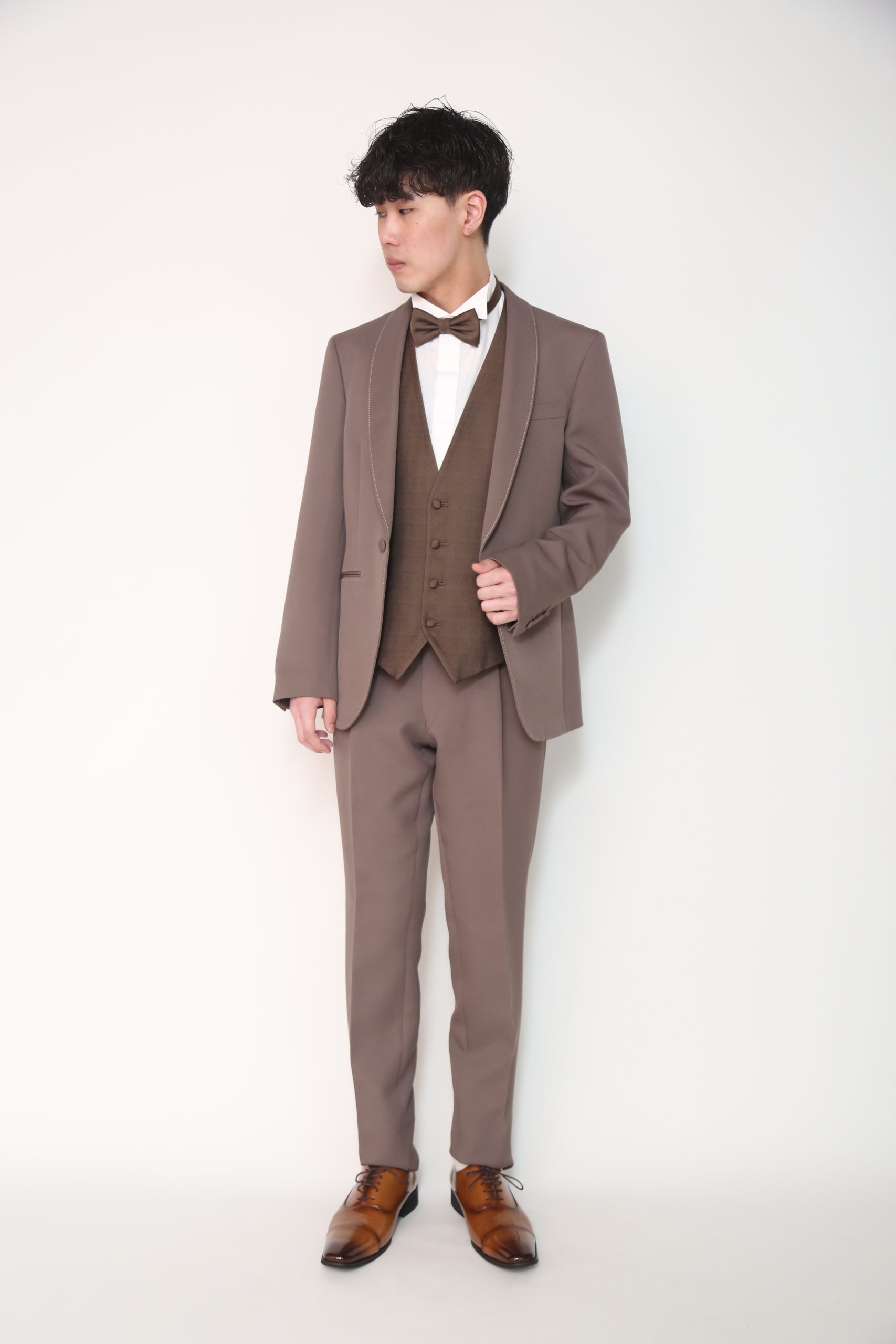 上品さと清潔感を感じさせるこの1着はタキシードの襟元がスエード生地になっており