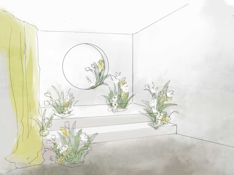 オレンジ、青をベースにしたイメージです。このお花が天井を覆い、華やかなシーンを演出します。